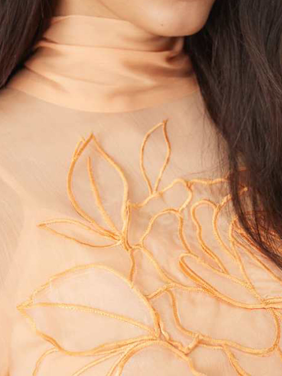 Applique Floral Tie Neck Blouson Sleeve Maxi Dress