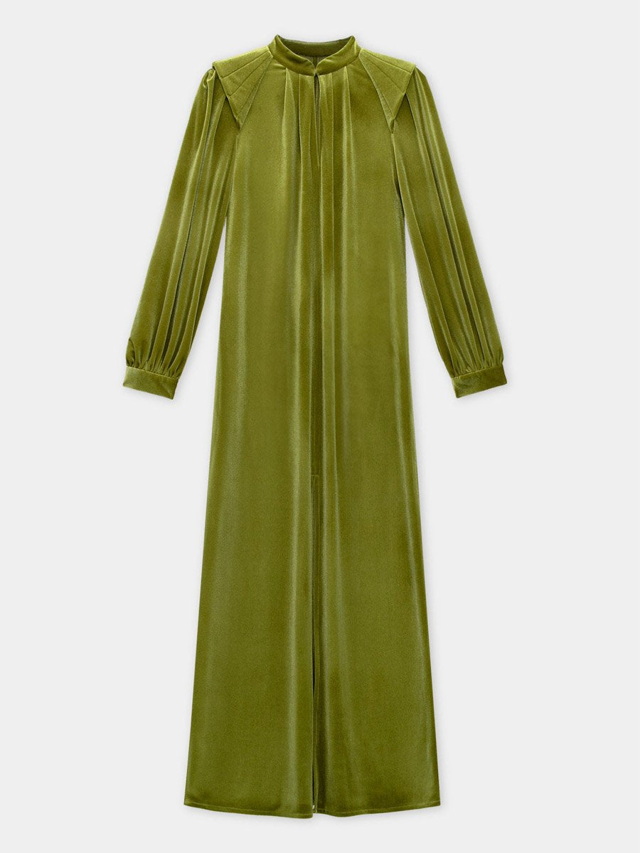 It is a straight-cut velvet midi dress with geometric pieces stitched on the shoulders.