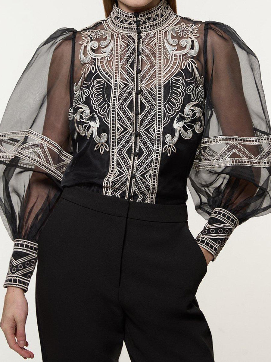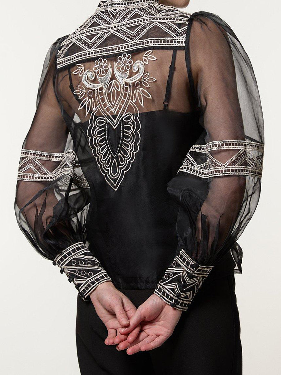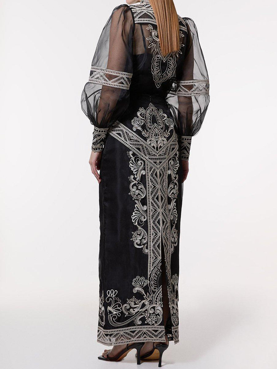 Embroidered Organdie Balloon Sleeve Two Pieces Dress