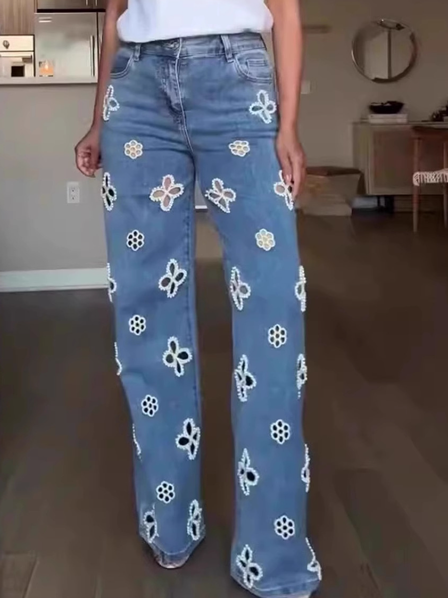 Embroidered Pearl Hollow-out Stretch Straight Pants