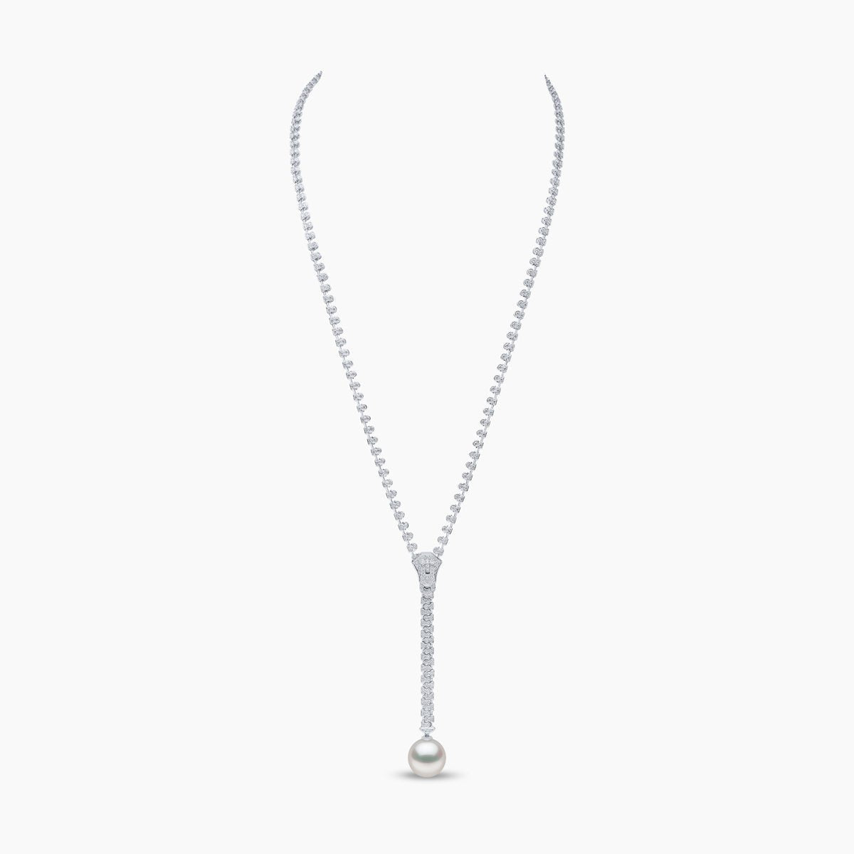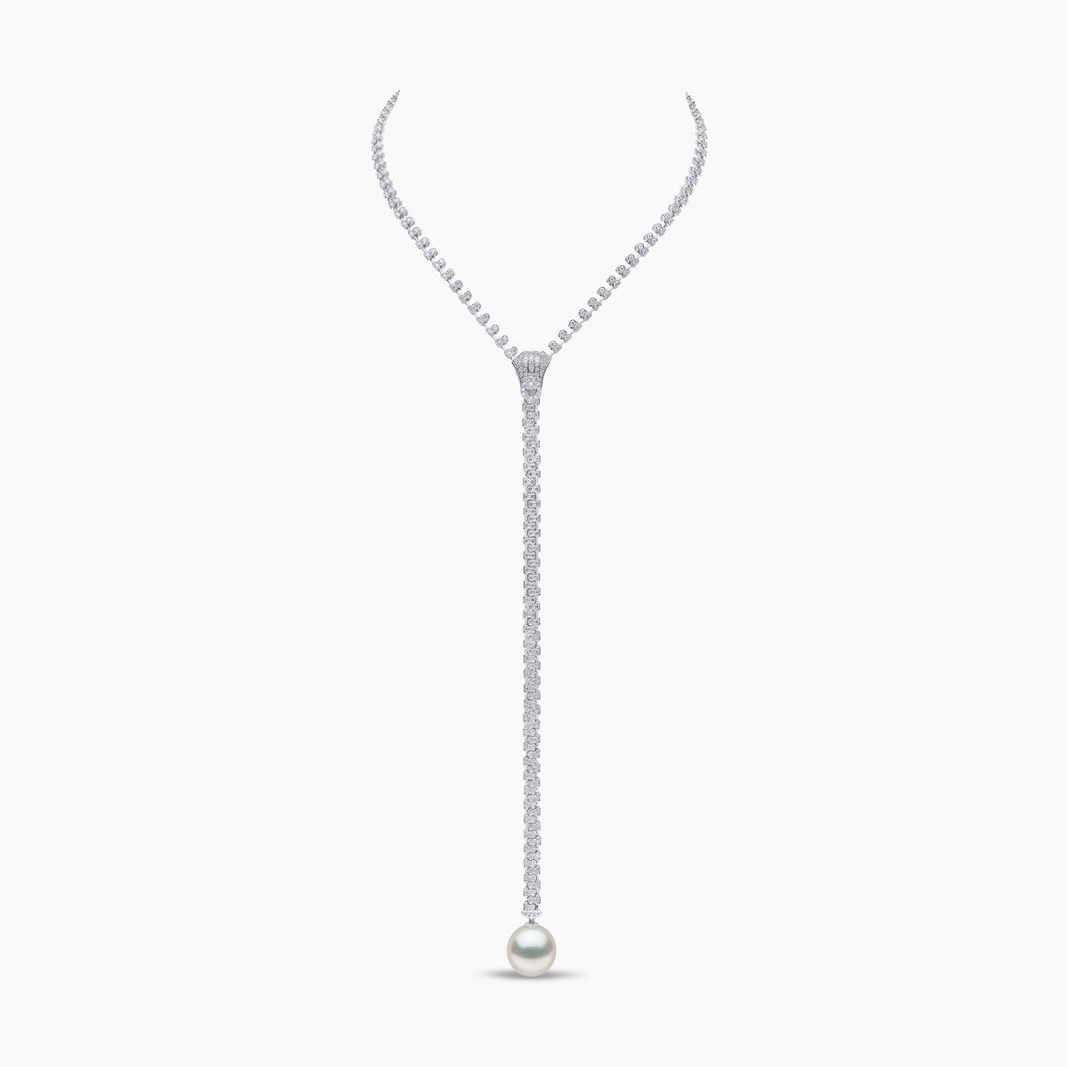 Introducing the diamond zipper necklace, a modern 18K white gold masterpiece. Featuring a lustrous South Sea pearl, this piece combines ingenious design with pure luxury. The unique zipper mechanism allows for adjustable length and style, while the removable pearl offers endless customization.