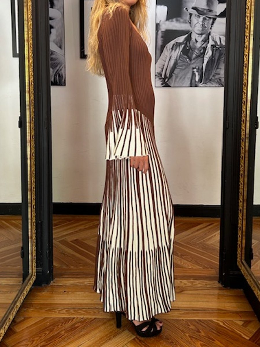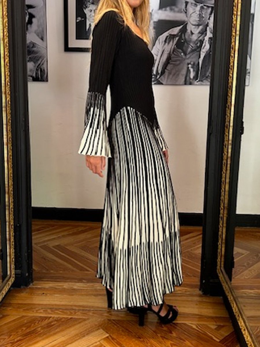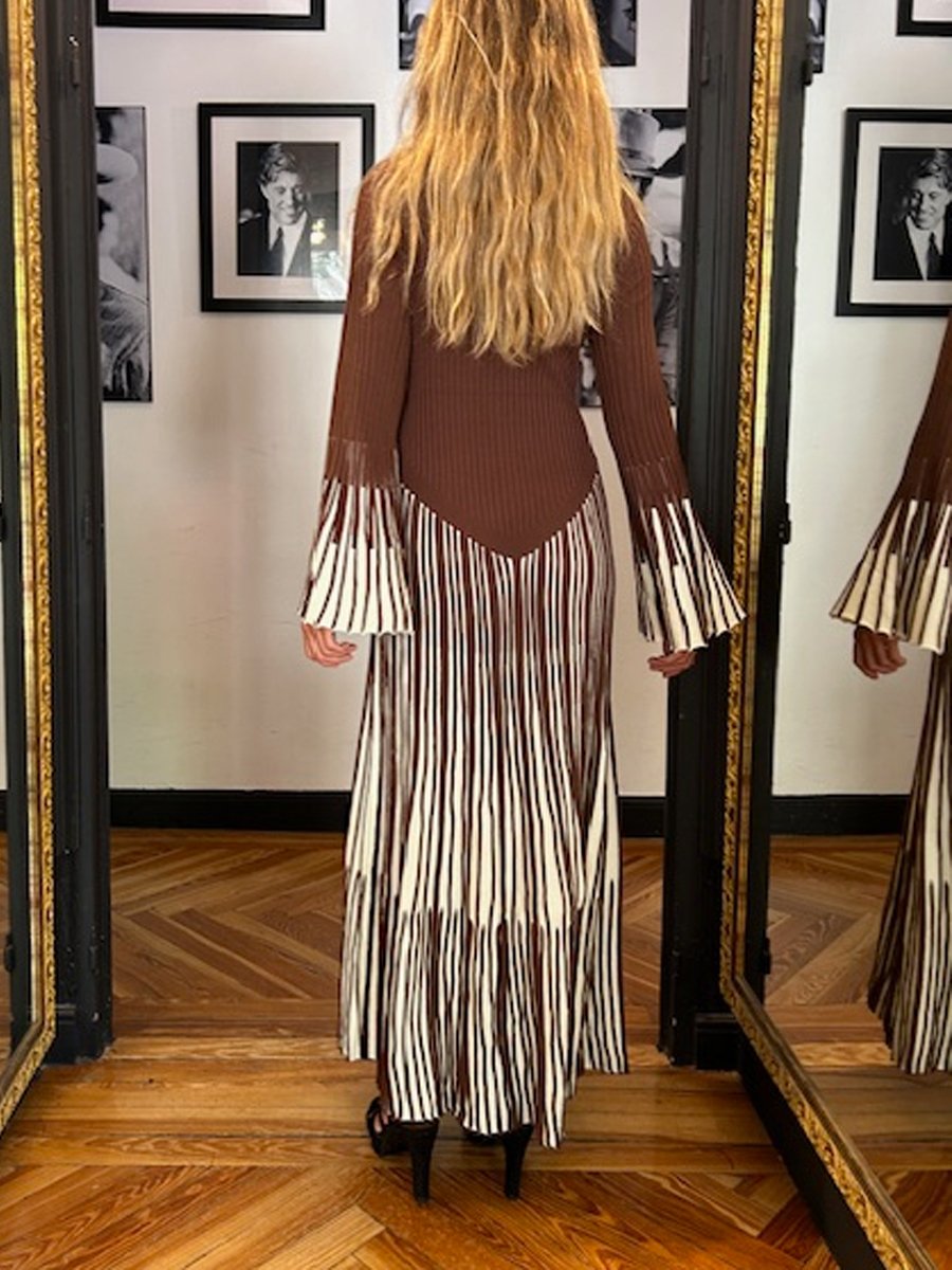 - Details: Bell sleeves finished with stripes, and an A-line skirt also finished with stripes.
