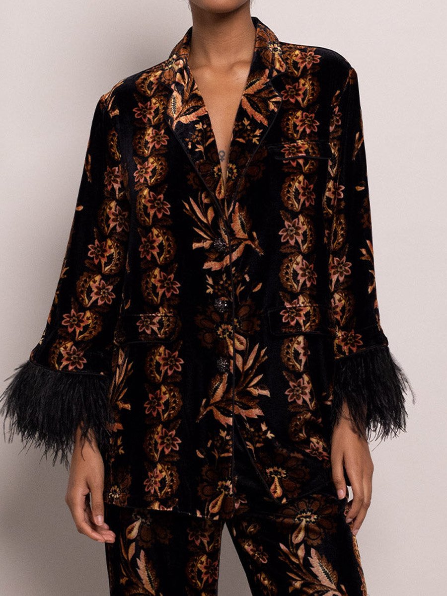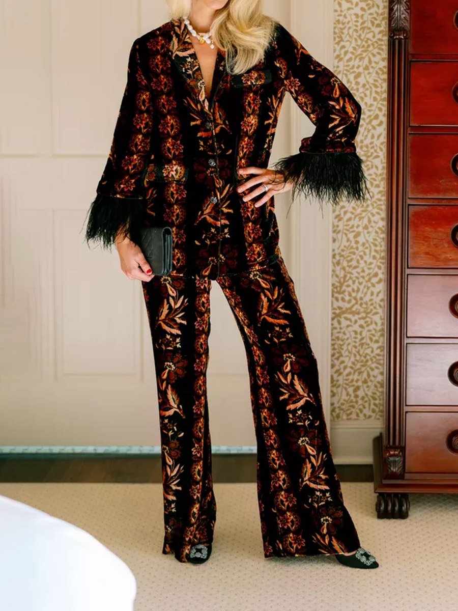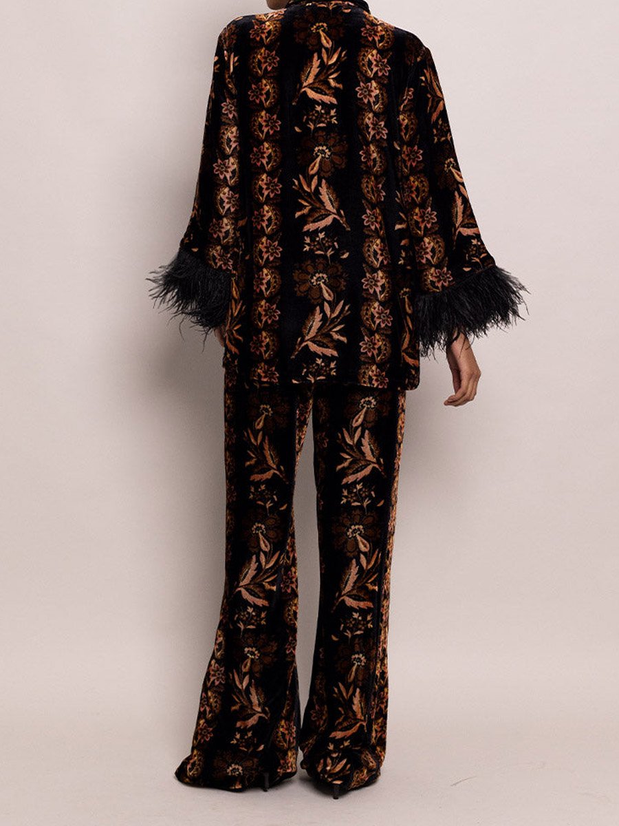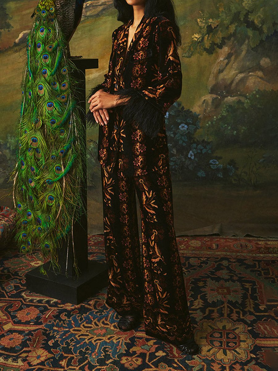 Concealed zipper fastening. High waisted. Full length wide leg. Fully lined. Placed print.